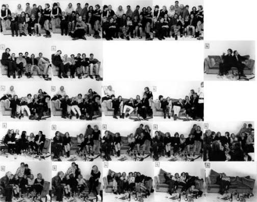The 'memorial room' was next to the room with 'the sofa'. Visitors to the exhibition could sit and watch the 'Official Opening of the Sofa' and the ensuing party, on the video. They were watching people on the sofa they were siiting on, but on a different occasion. The video is a frame-filling image of the sofa during the whole evening, in real time. On the wall behind the sofa was a picture of my mother as a young woman, and around the room was a frieze of the photos taken at the 'Official Opening of the Sofa'. |