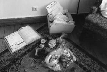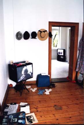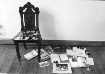 | The second step was a more pubic affair as I felt the subject matter has a lot to do with a lot of people. I had conceived the exhibition to take place in three rooms of my own flat. It was important to use this space, my home here in Germany. The first room was a kind of 'memorial room' to my mother. Here were small objects and pieces of furniture that my mother had owned and that had been part of her daily life. There were some written expressions from her, concerning her life, and there were photos of her as well as life sized computer print outs from them. I also showed a short film and video of her on a monitor, which was placed opposite her old armchair |