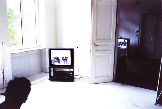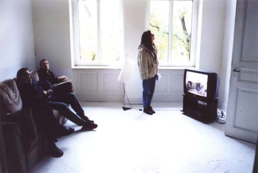 | In the third room was another sofa on which visitors could sit and watch the same image as next door, but a transmitted image from the live situation on the sofa. This image had been technically manipulated to create the shadow of movements in the picture - so that the past of a current movement could also be seen for a few brief moments. Three rooms. Temporal zones, mixing areas of the past with the present, like a memory. |